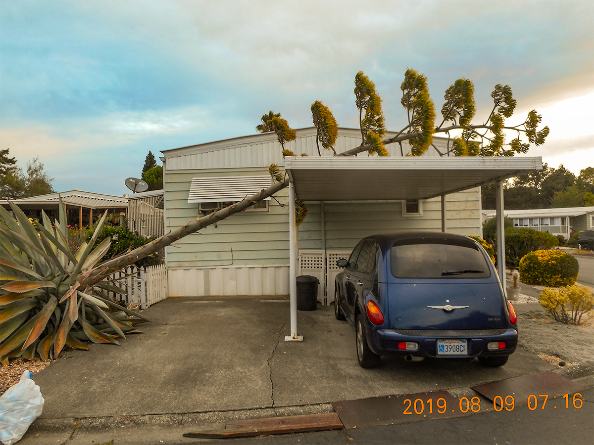 In spite of its weight, the only damage was a small dent in the roof of the carport. However, it exercised the maintenance crew who needed almost three hours to remove it. Rest in peace aggravating agave!